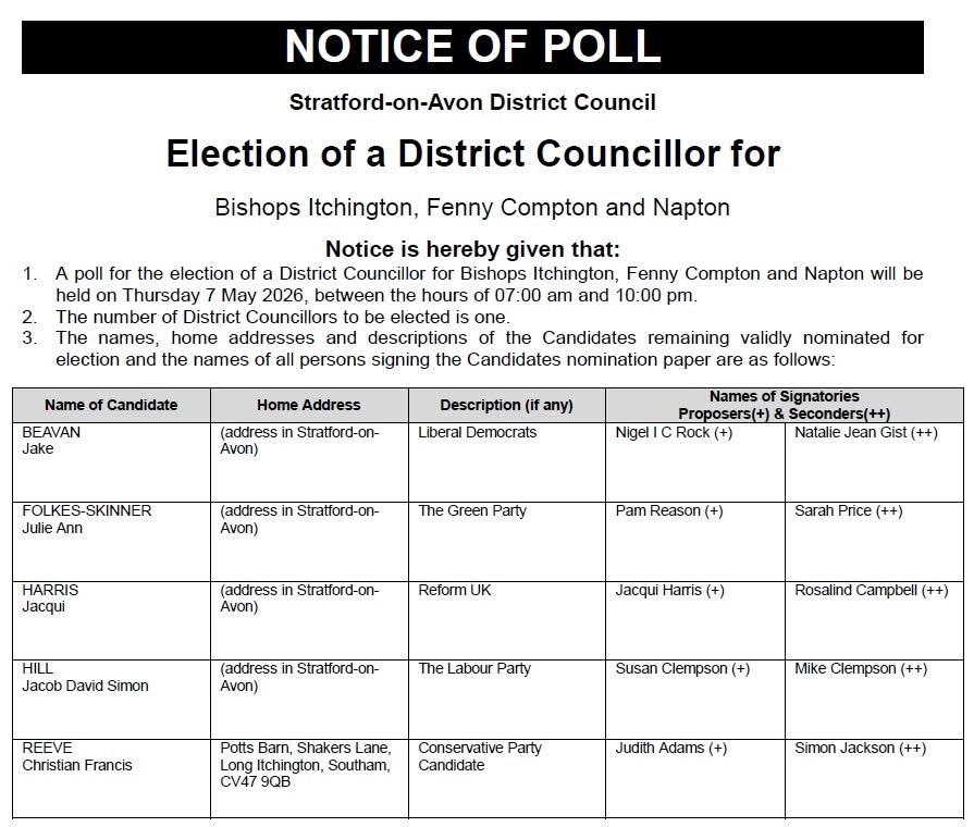 Candidates announced for the by-election in Bishops Itchington, Fenny Compton and Napton ward which includes Avon Dassett: https://orlo.uk/wE3zU